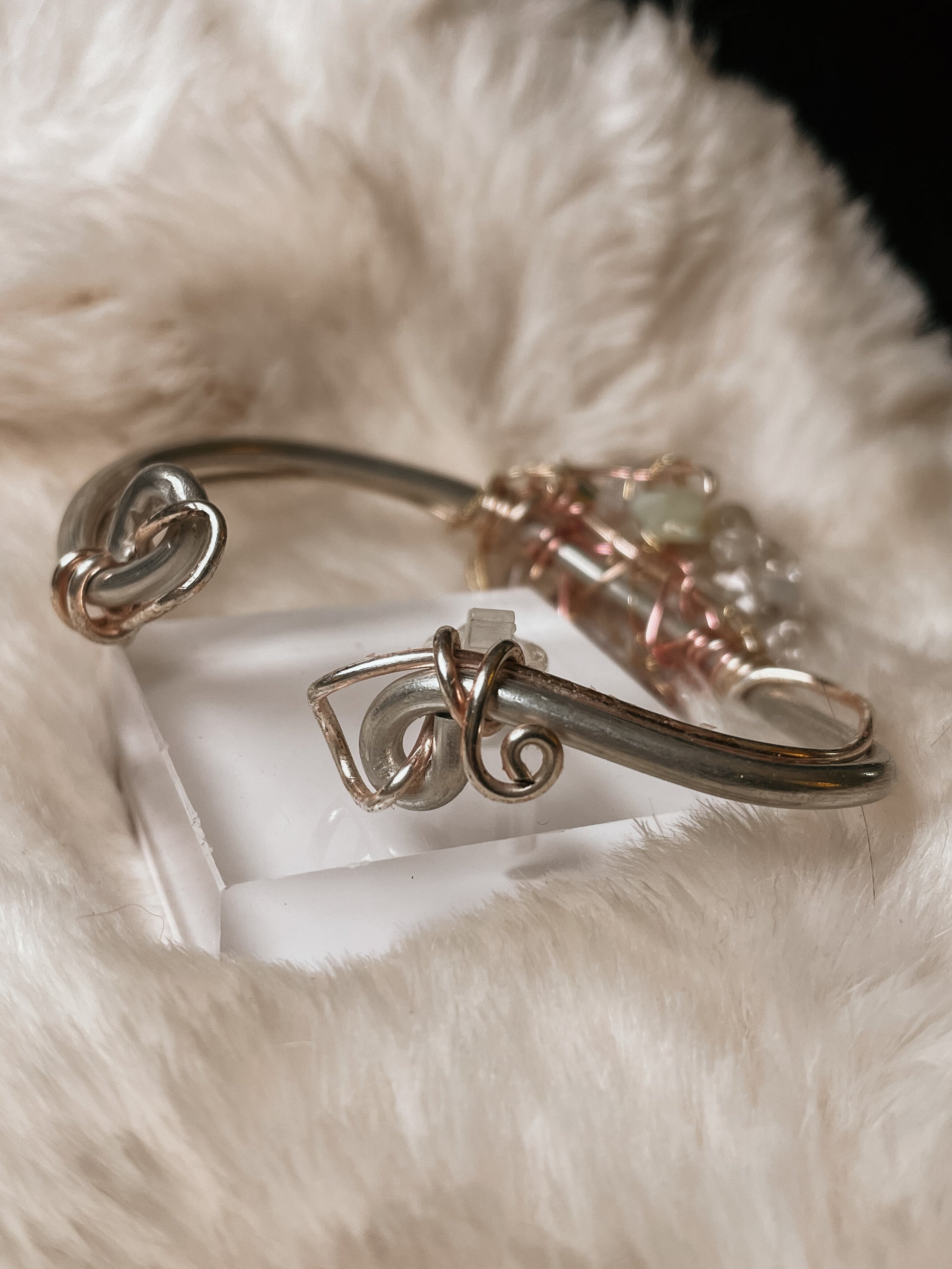 The crystal is wrapped in hand-formed Argentinian silver, accented with warm gold-toned wire and shimmering crystal details that catch light like stardust. The structure is intentionally organic, allowing the bracelet to shift and reveal new facets depending on how it’s worn—just as Amalthea’s story changes depending on who is brave enough to see her clearly.