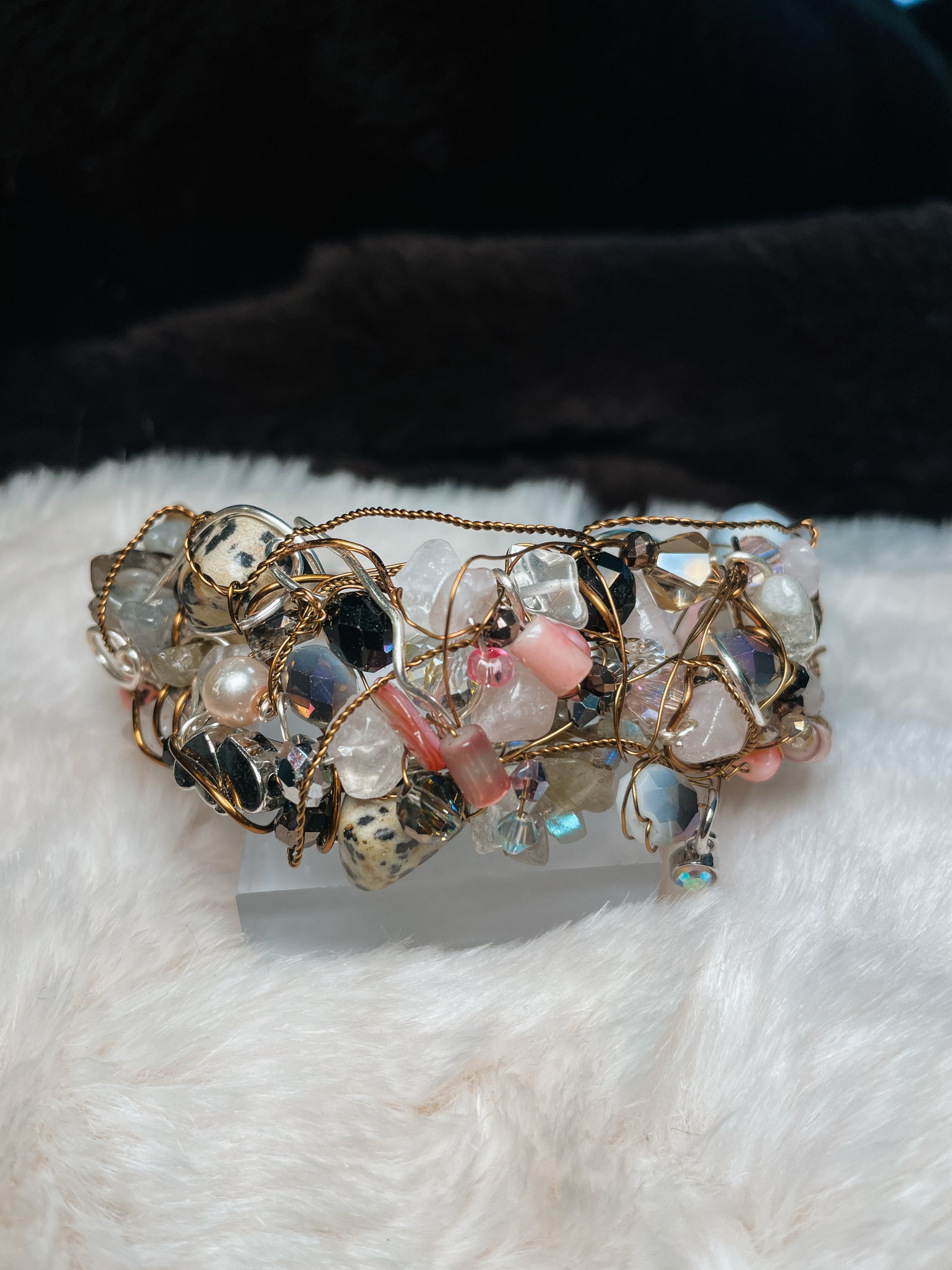 Featuring rose quartz, clear quartz, dalmatian jasper, opalite, and citrine, the piece is accented throughout with faceted Swarovski crystals that catch the light from every angle. Each stone is individually wrapped, creating a textured, almost botanical composition — like a crystal garden grown around the wrist.