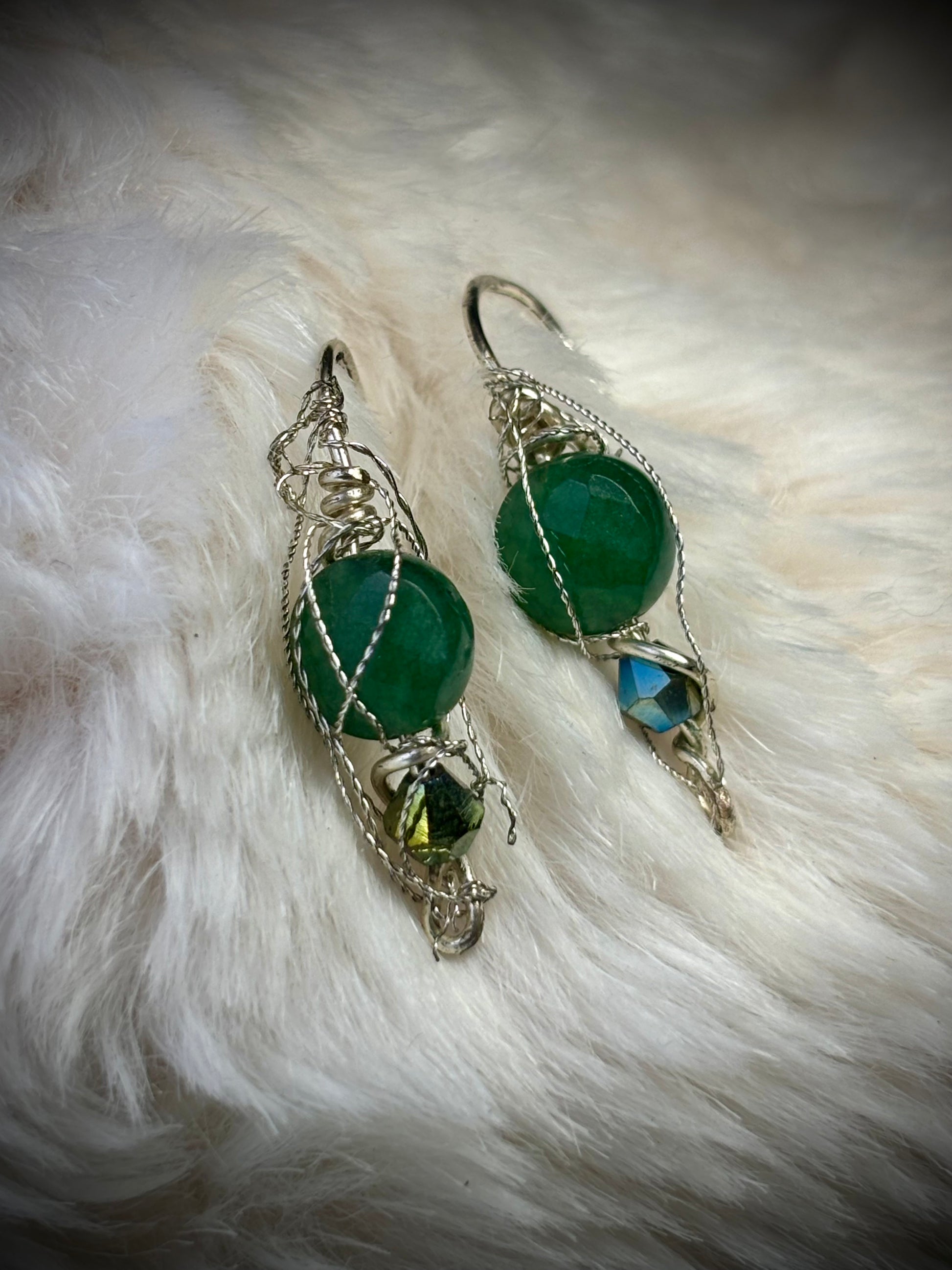 These earrings were shaped as quiet sentinels — small but powerful guardians meant to watch over the wearer. The deep green Nephrite stones rest within flowing silver lines that resemble protective vines, while the shimmering crystals catch light like hidden forest dew. They were formed to feel like whispers from an ancient grove, offering steady protection and calm awareness with every movement.