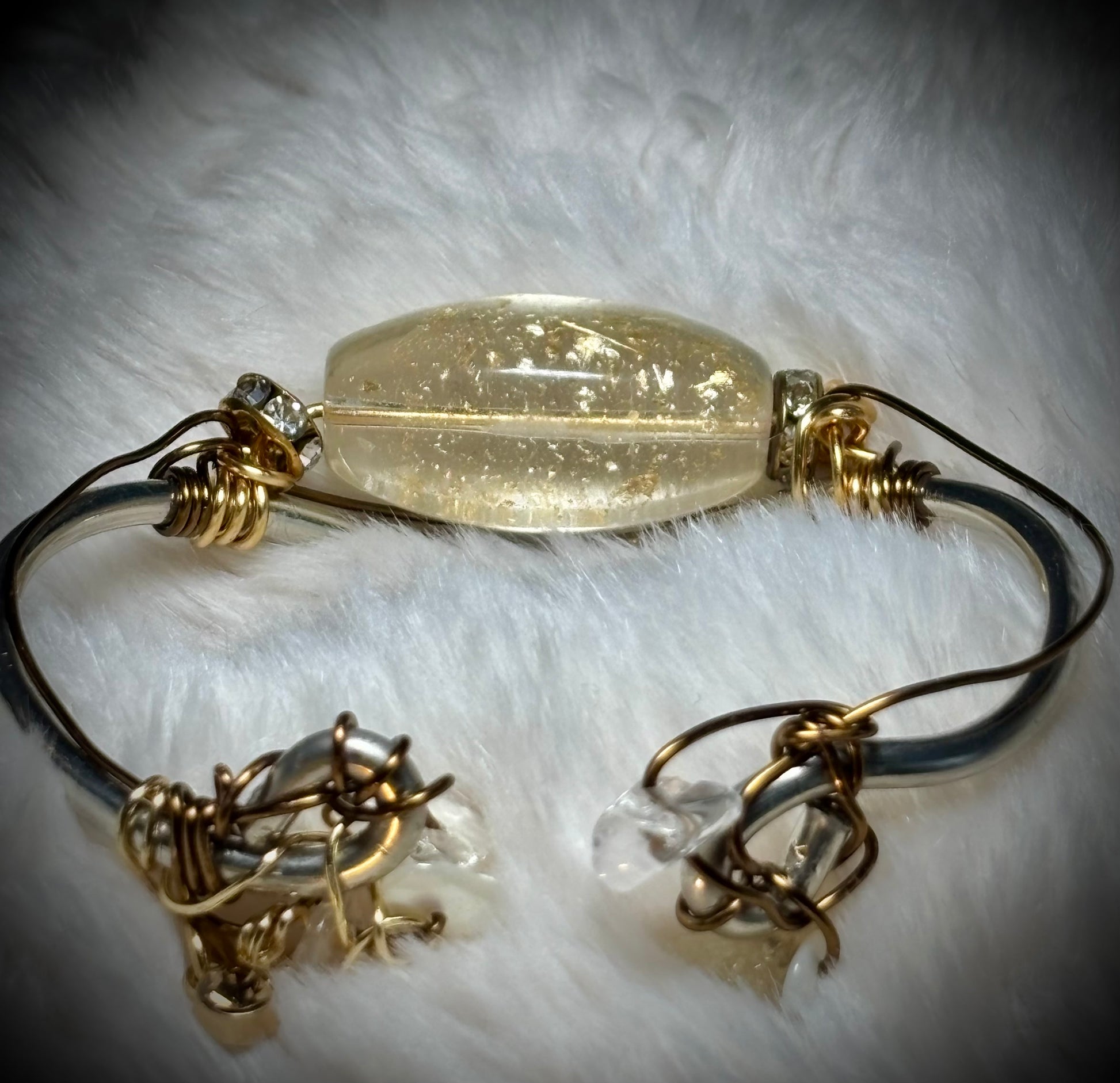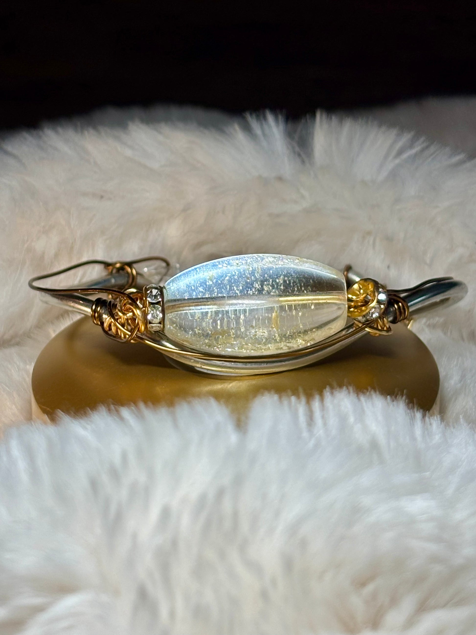 I shaped this bracelet with flowing Argentinian silver, allowing the lines to arc gracefully around this captivating, luminous gold flake, crystal glass. Reminiscent of the Murano glass from Venice. Suspended within this wonder, are fragments of golden leaf that appear like sunlight captured and preserved inside crystal.