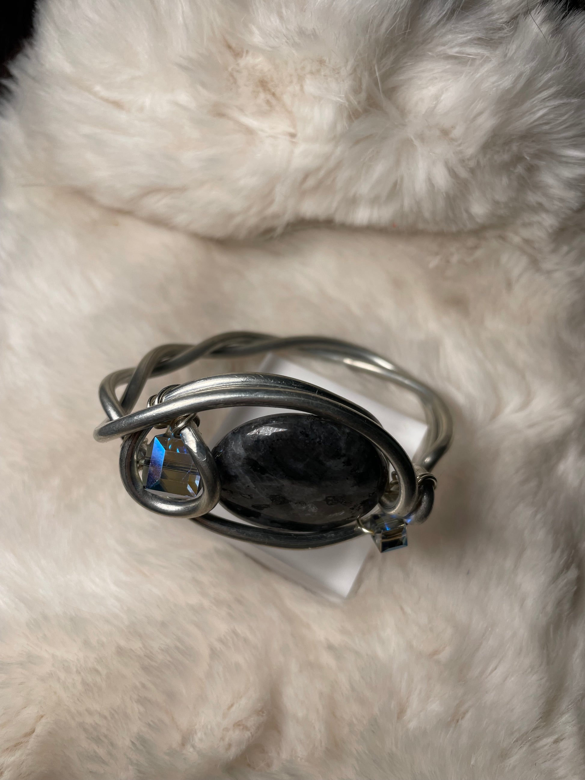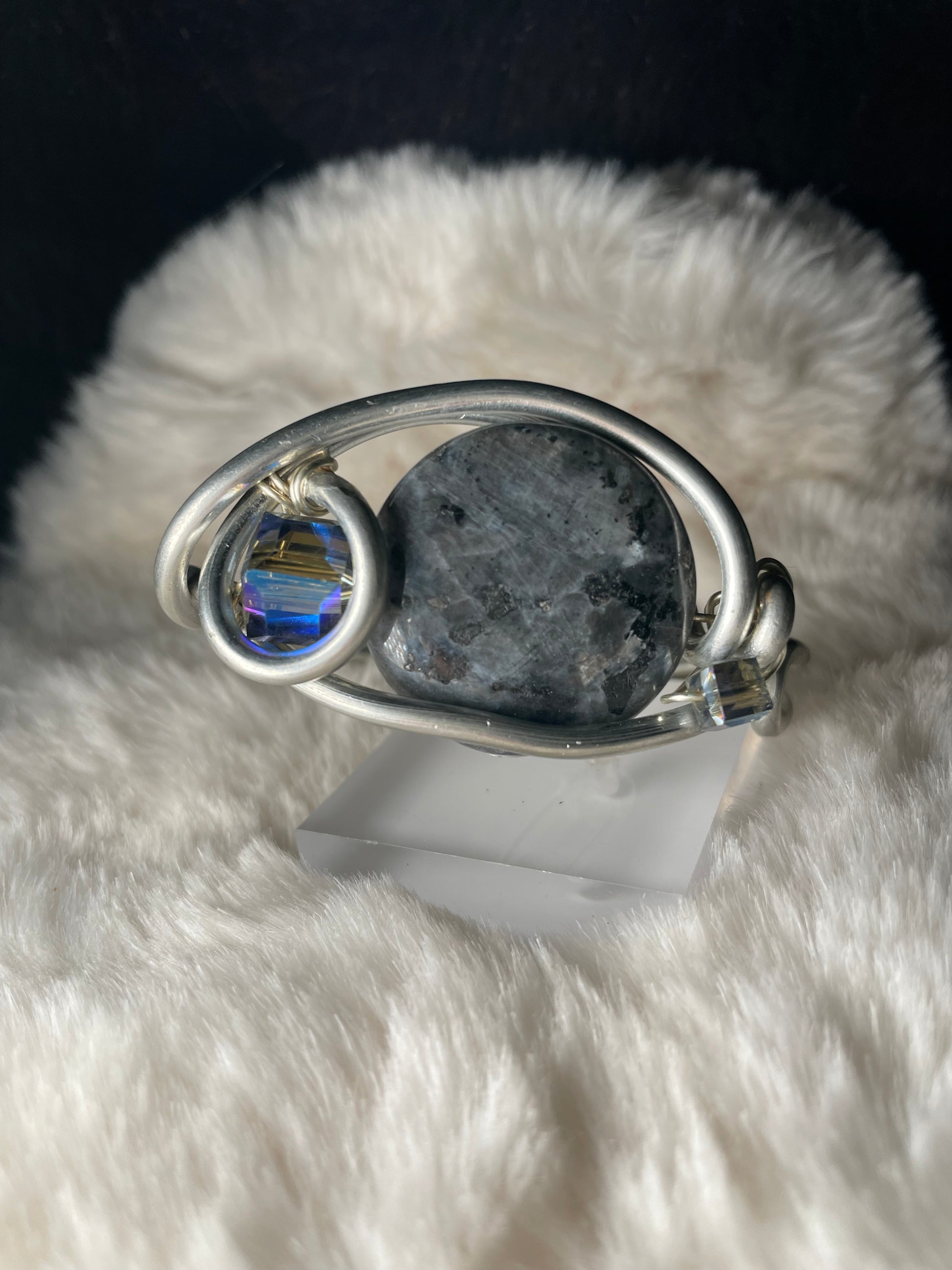 At the center rests Larvikite, also called Black Moonstone, a stone of the moon and night sky. Its deep charcoal surface carries natural flashes of silver, symbolizing inner vision, protection, and the wisdom that comes from stillness rather than force. Larvikite is associated with grounding intuitive energy, helping the wearer stay centered while remaining open to insight.