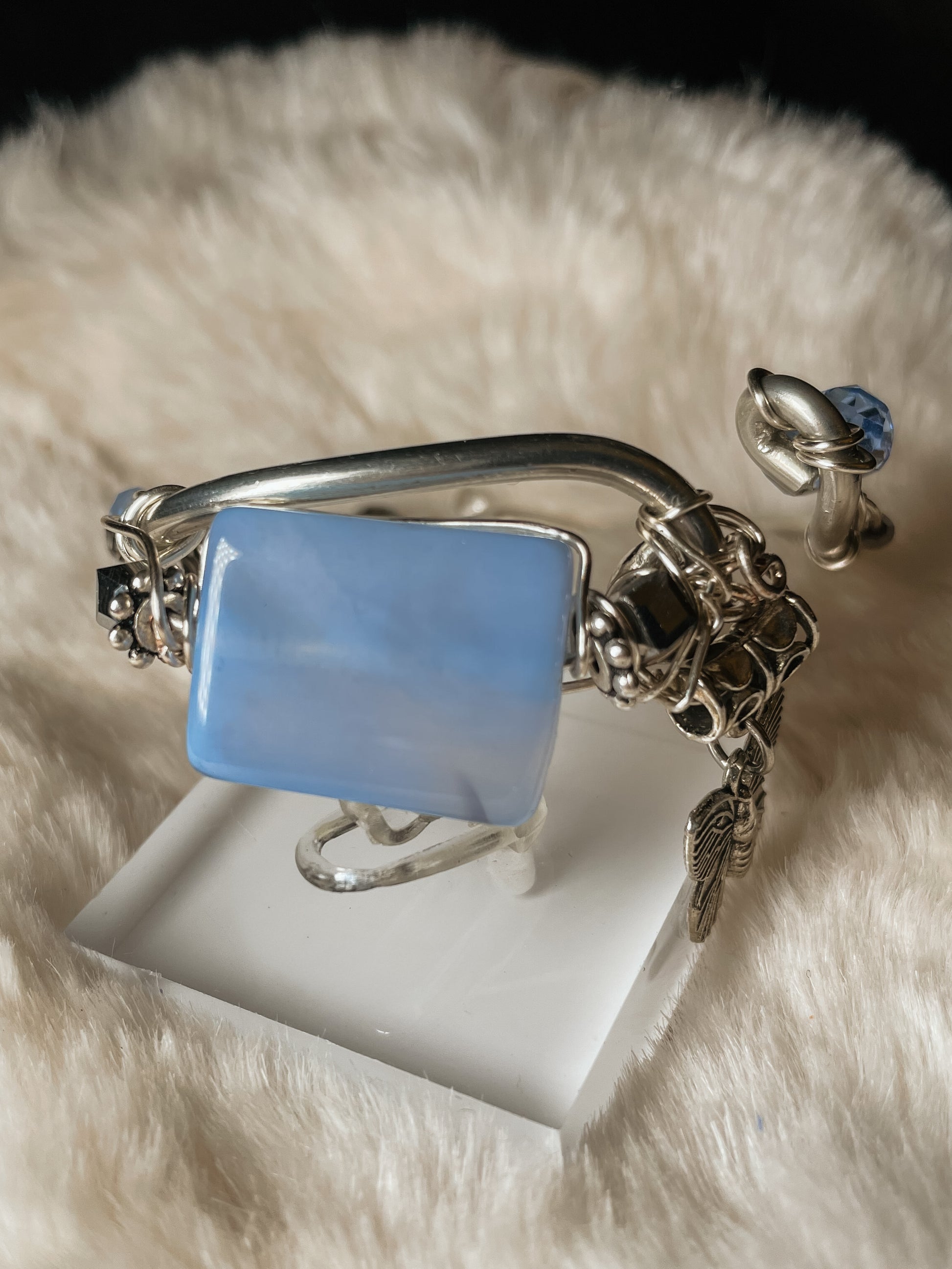 At its center rests a soothing blue lace agate, its delicate banding reminiscent of periwinkle skies and drifting air. A silver butterfly charm accompanies the stone, symbolizing metamorphosis, renewal, and the beauty of becoming without force. The silver framework is sculptural and organic, embracing asymmetry and natural texture so the bracelet feels found rather than fabricated.