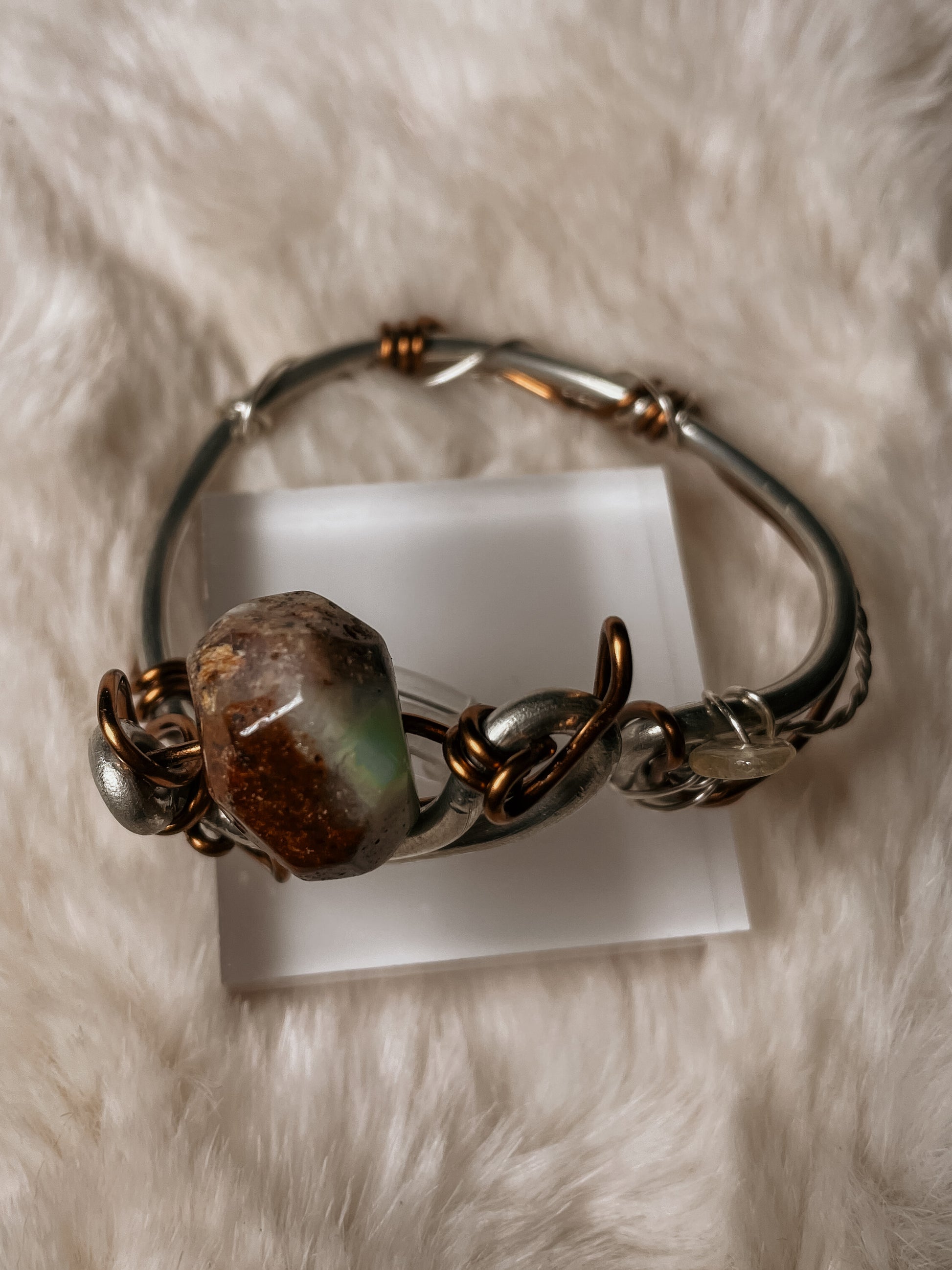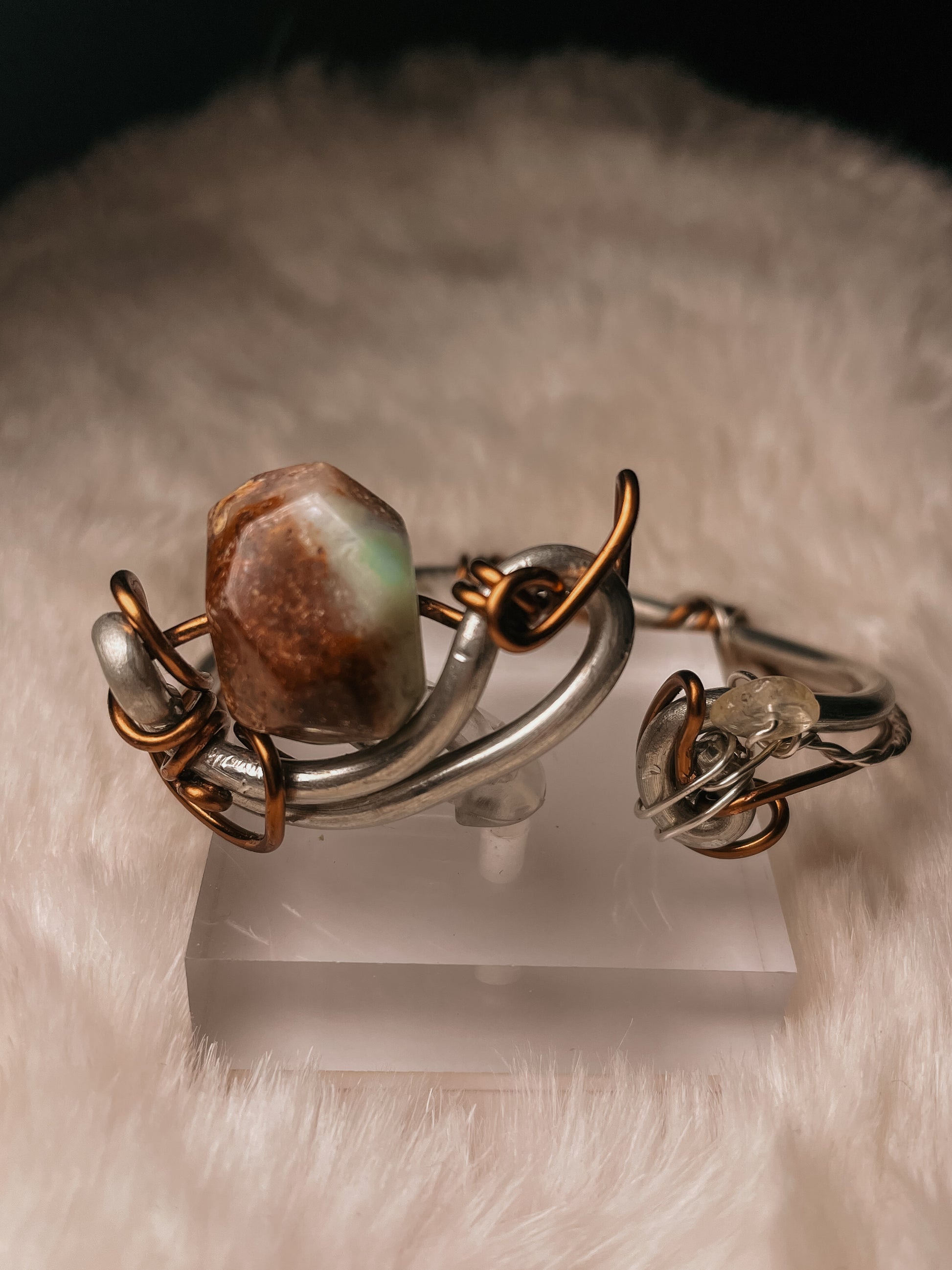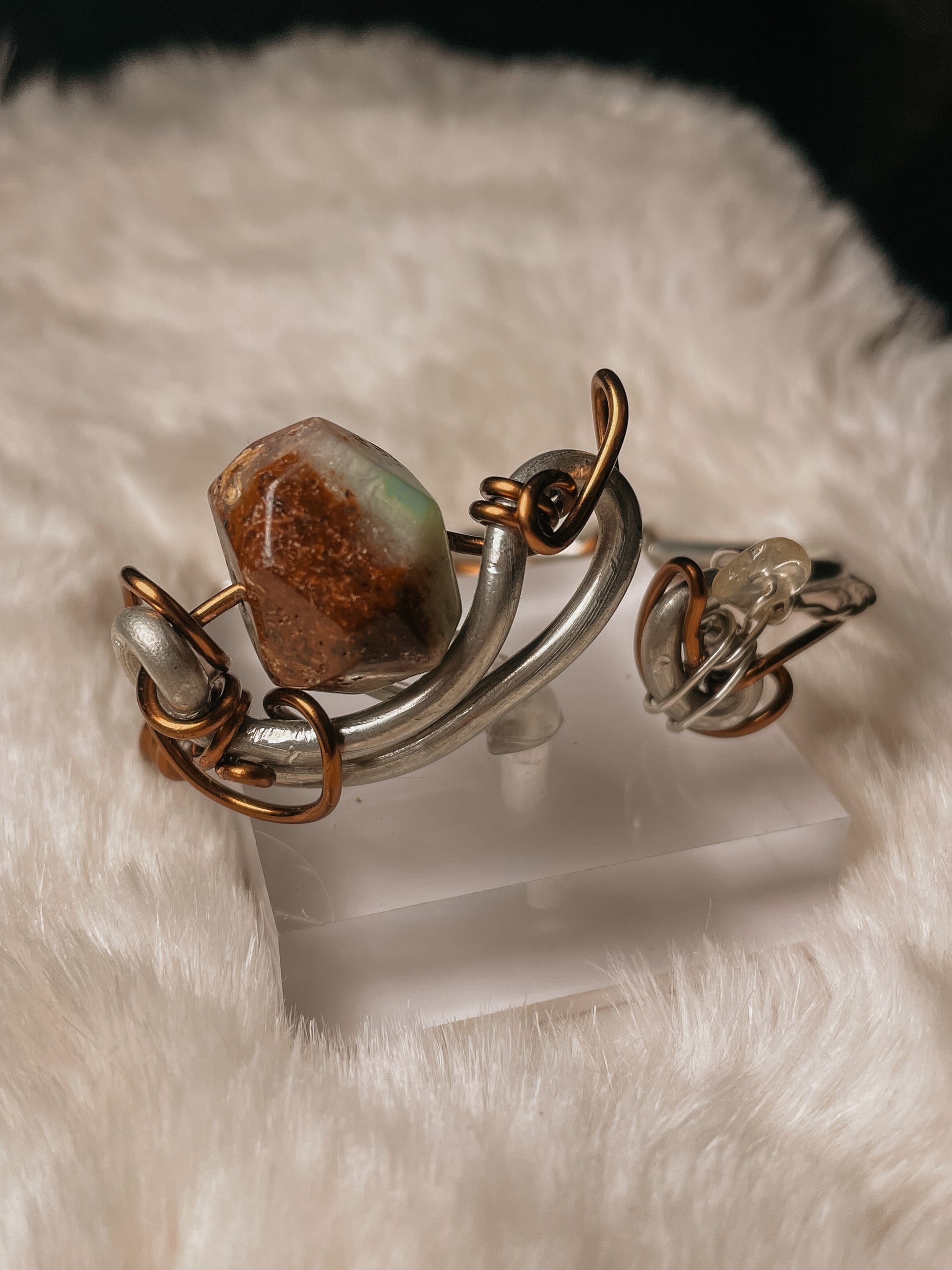 At its center is a naturally formed African green opal, paired with a subtle accent of citrine. The silver framework is sculptural and elemental, wrapping the stones in a way that feels discovered rather than designed. This bracelet can be worn multiple ways, allowing different details to come forward depending on how it’s styled.