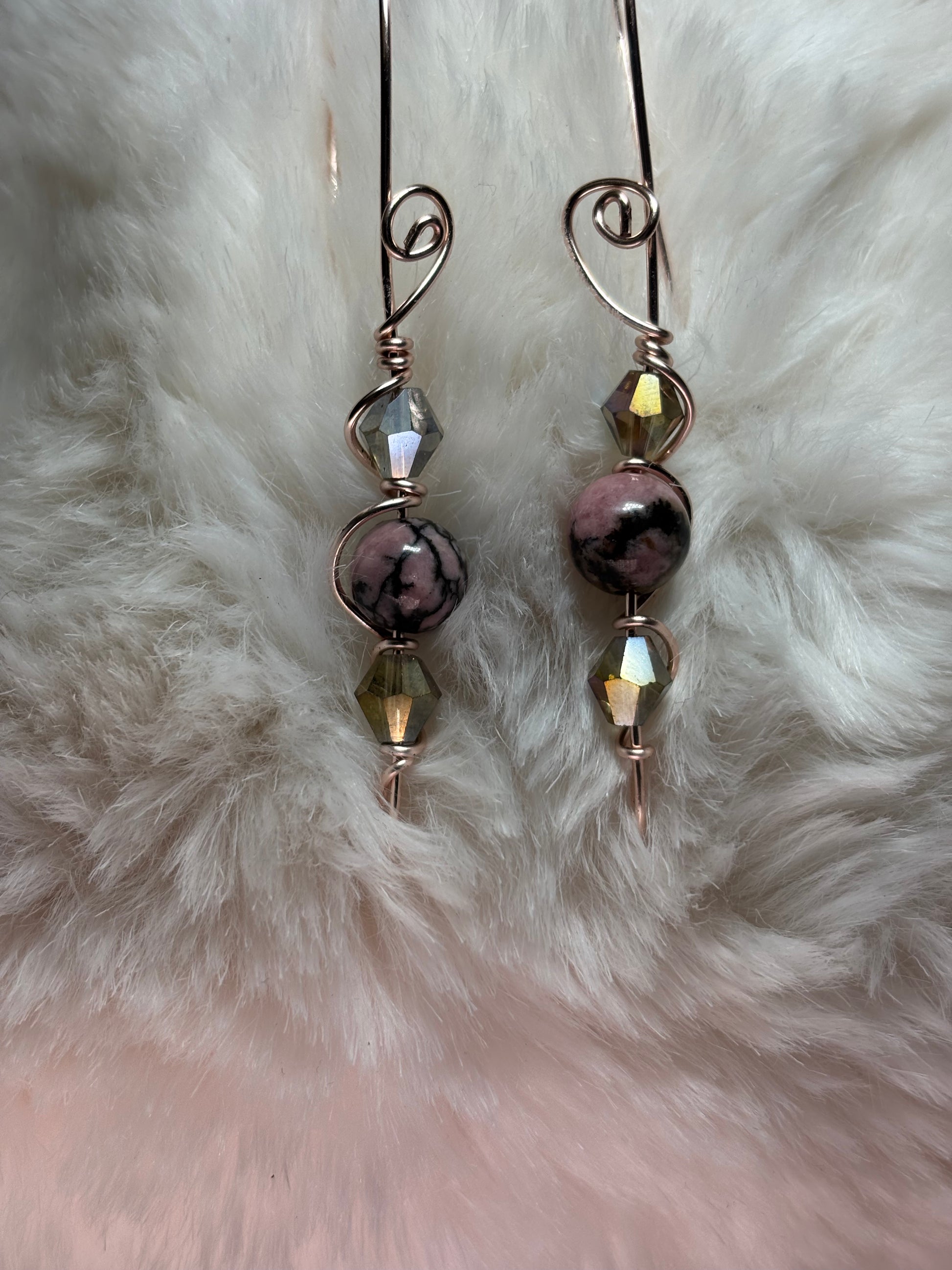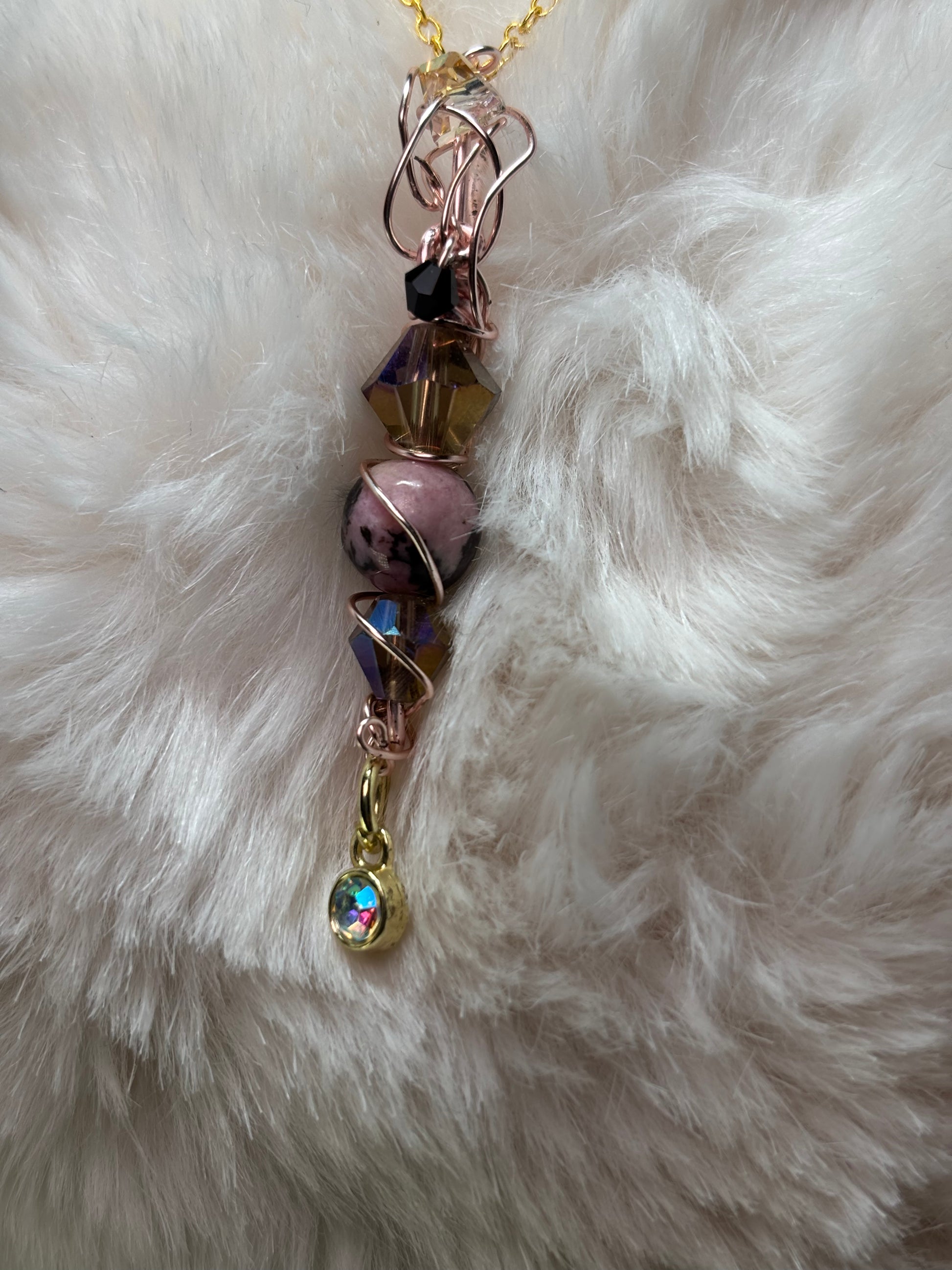 This gorgeous combo— soft rose tones with that dramatic black veining is classic Rhodonite 💗🖤 And the warm metallic crystals give it such a romantic, elegant edge.