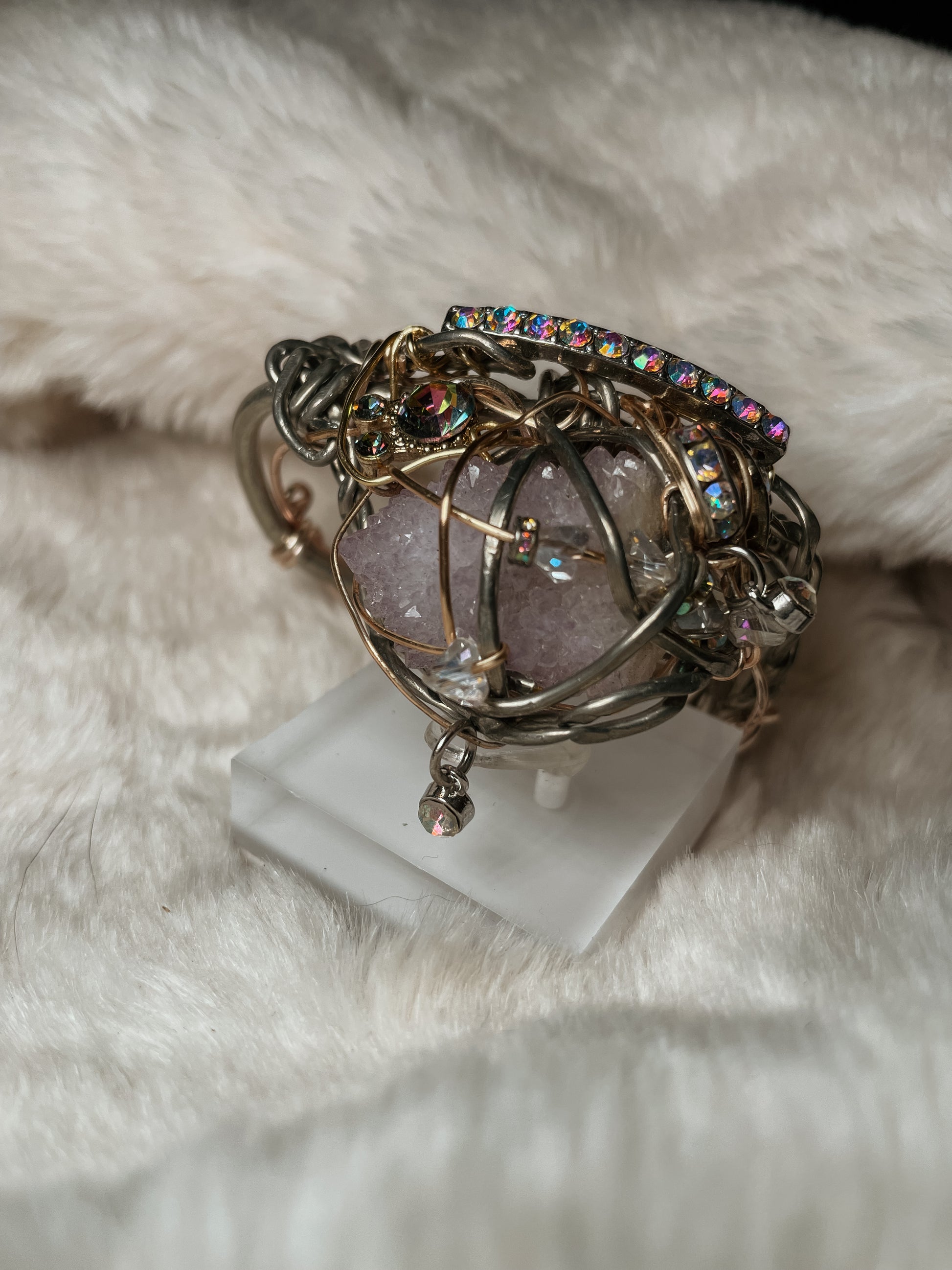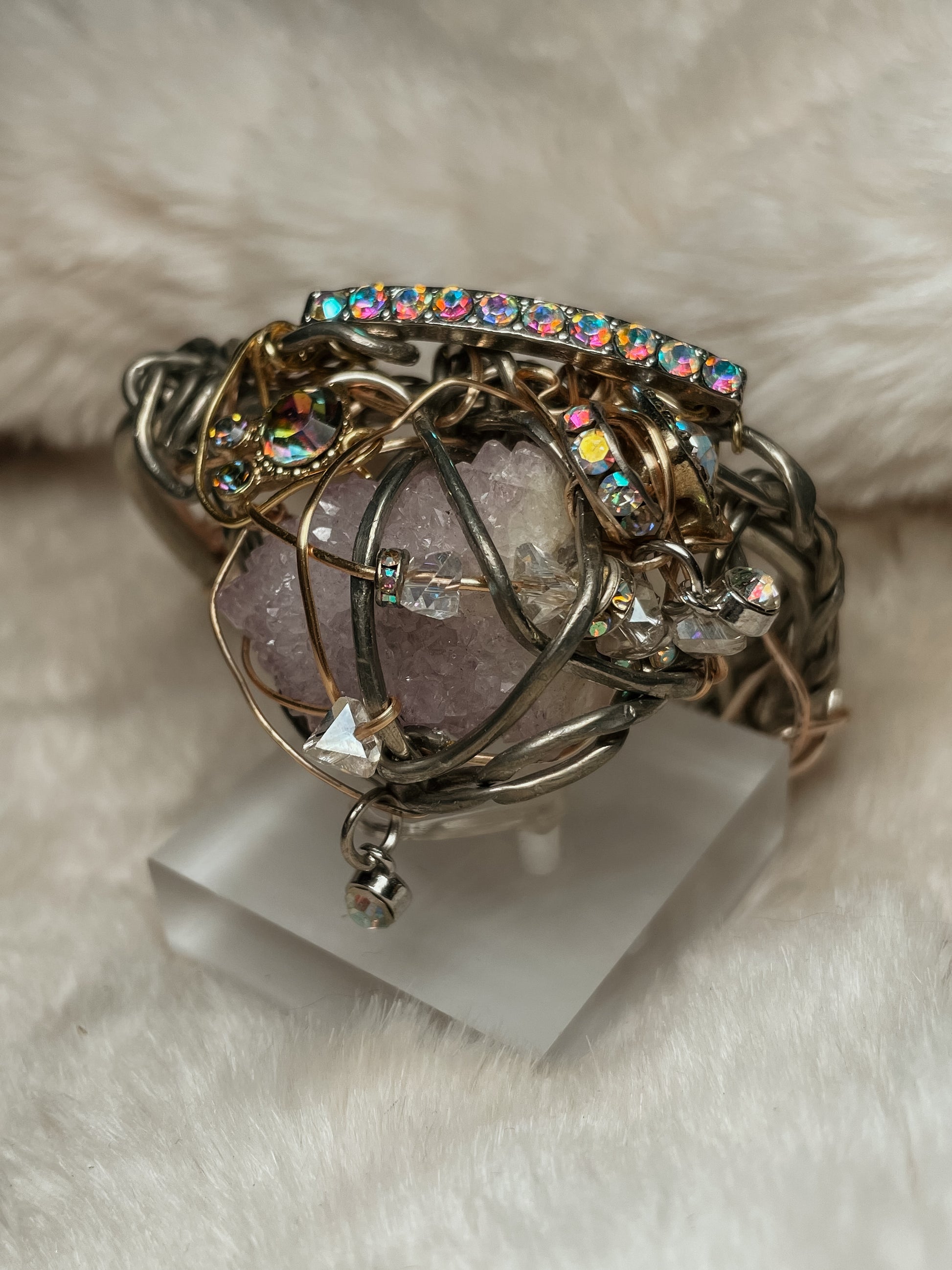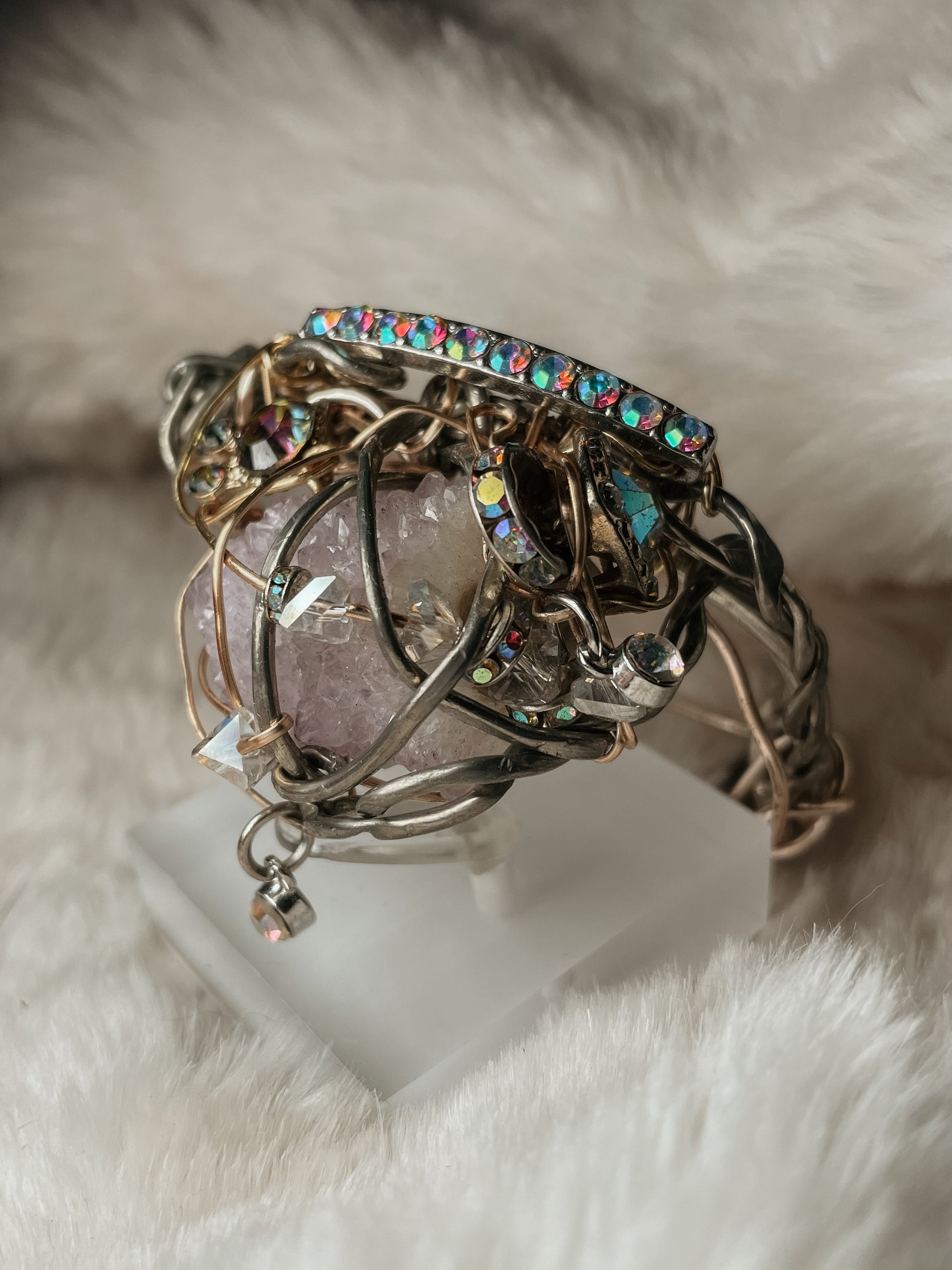 Iridescent crystal accents scatter light with every movement, creating a subtle, prismatic glow—like constellations shifting across a twilight sky. The design feels both ornate and organic, wrapped rather than set, collected rather than constructed.