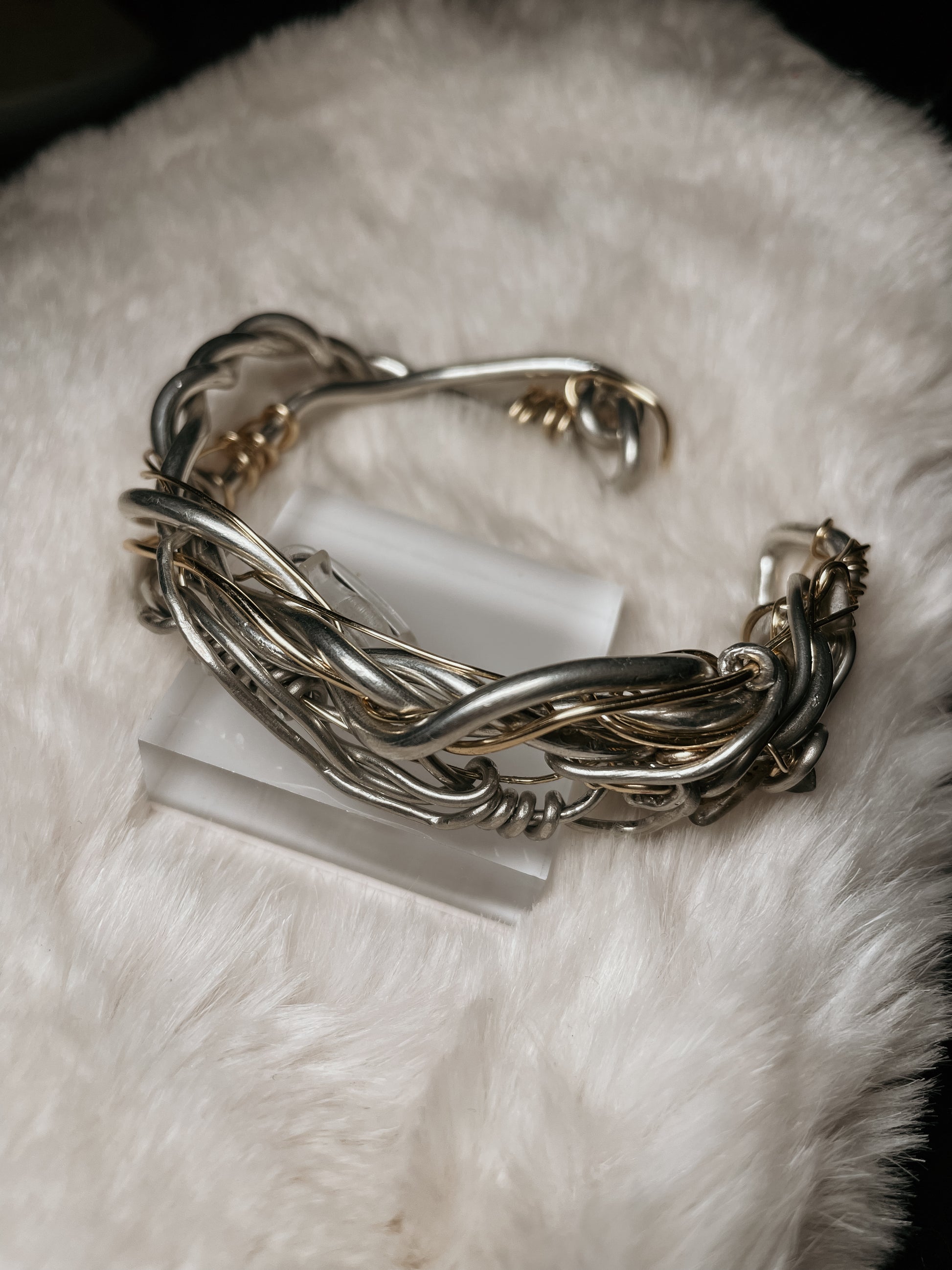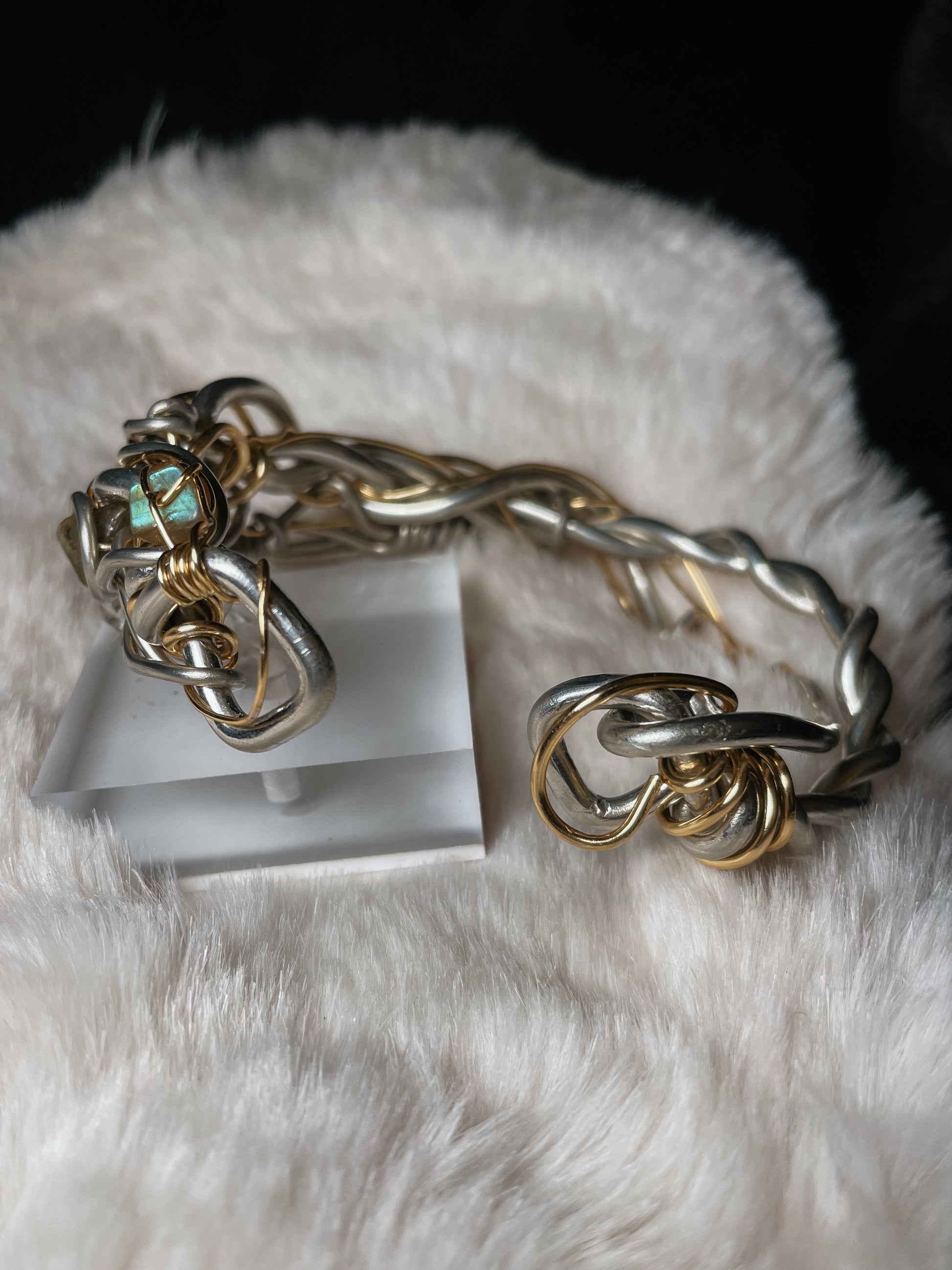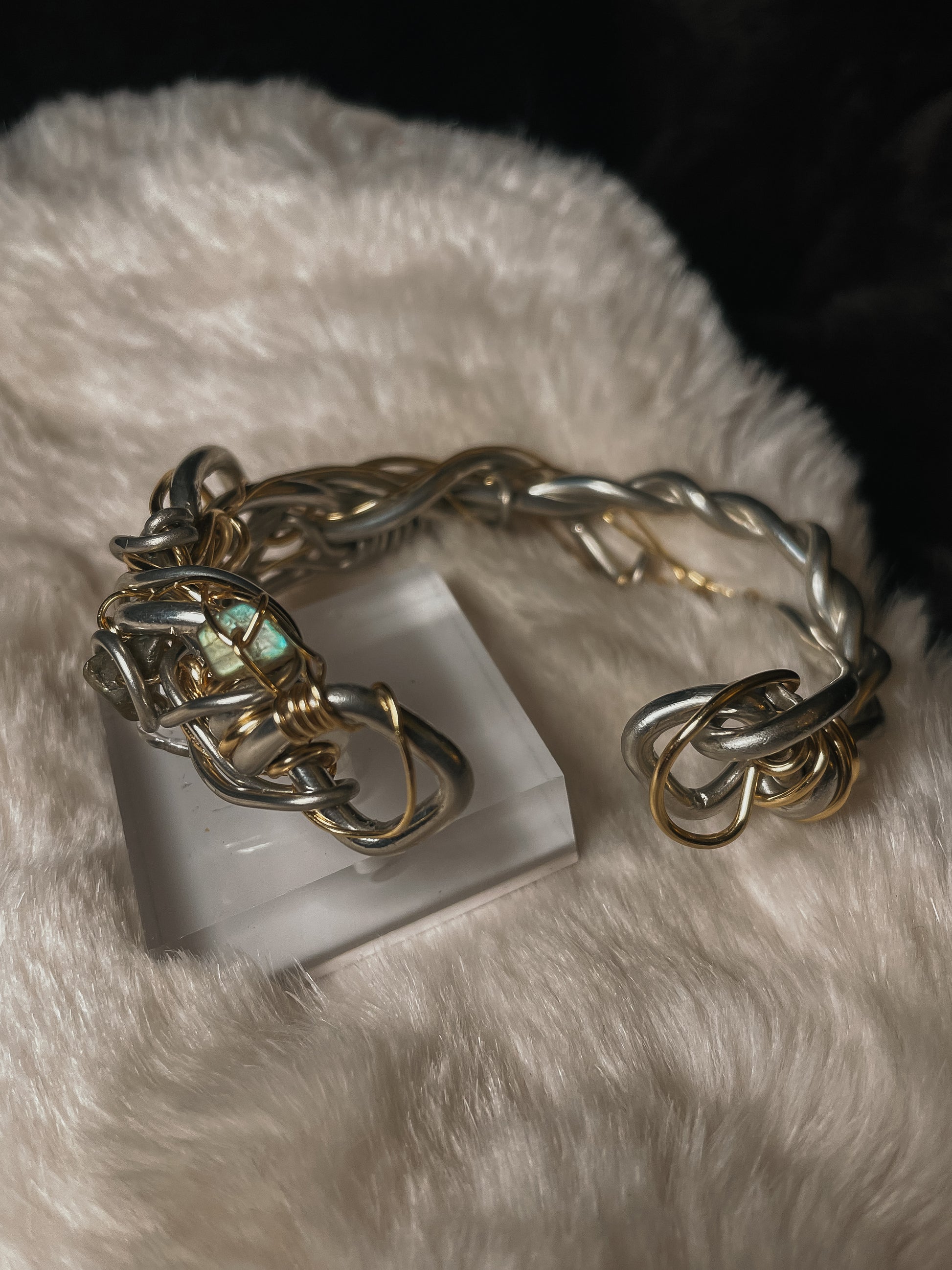Handwoven from solid Argentinian silver and accented with a natural labradorite stone, The Alchemist’s Knot Cuff is a powerful piece of wearable symbolism. Flowing strands of silver and gold-toned wire intertwine organically around the wrist, protecting and framing the labradorite — a stone known for intuition, transformation, and inner strength. Each cuff is shaped entirely by hand, making no two pieces alike. Designed as a talisman for creatives, seekers, and those drawn to subtle magic.