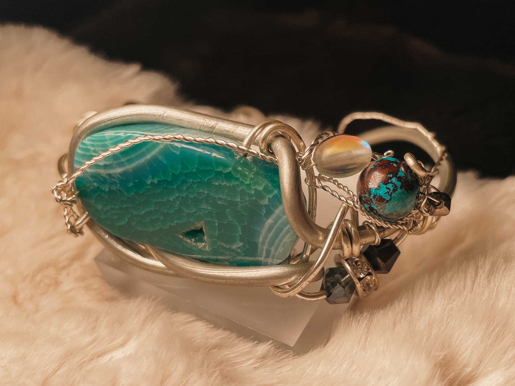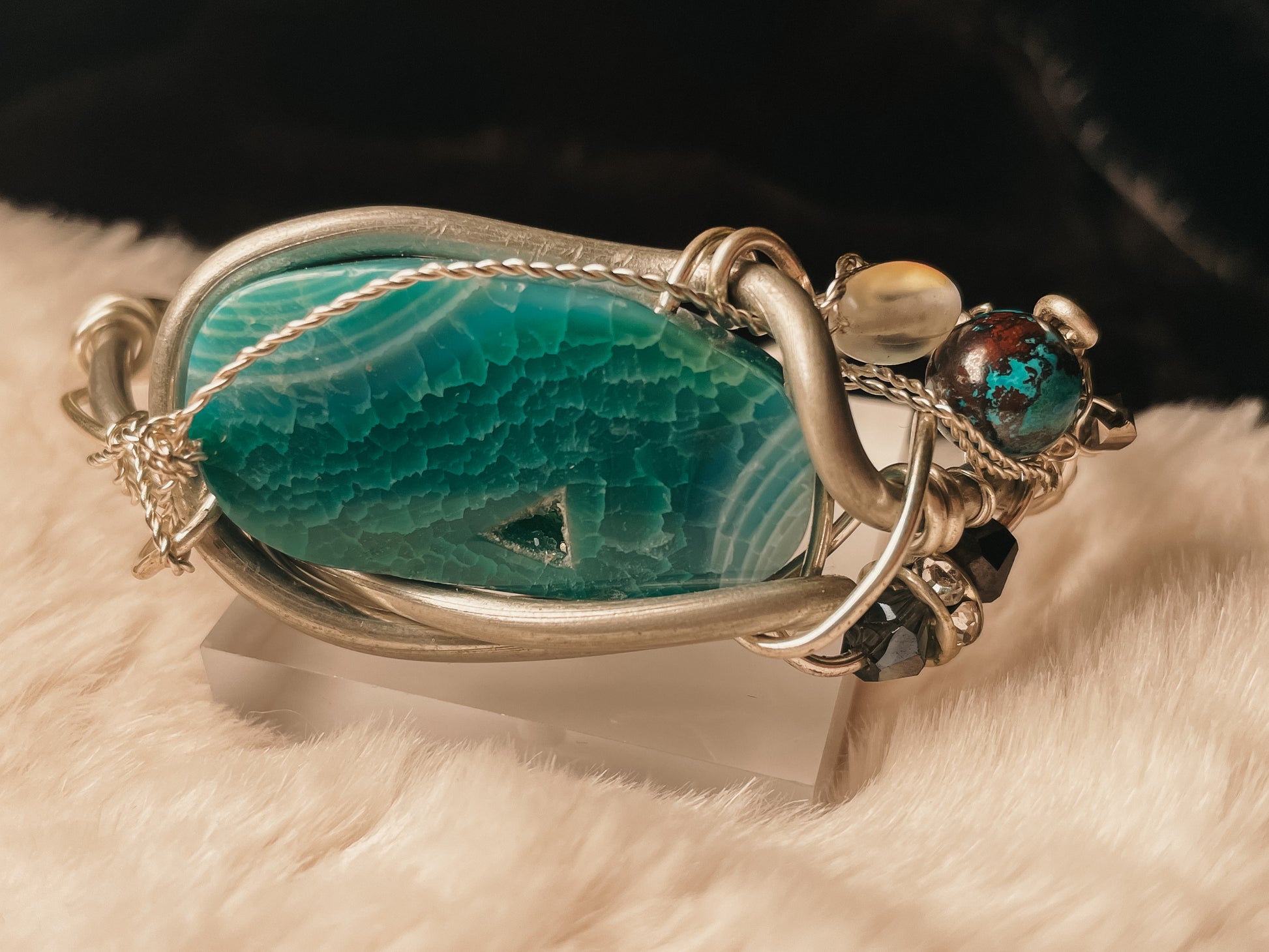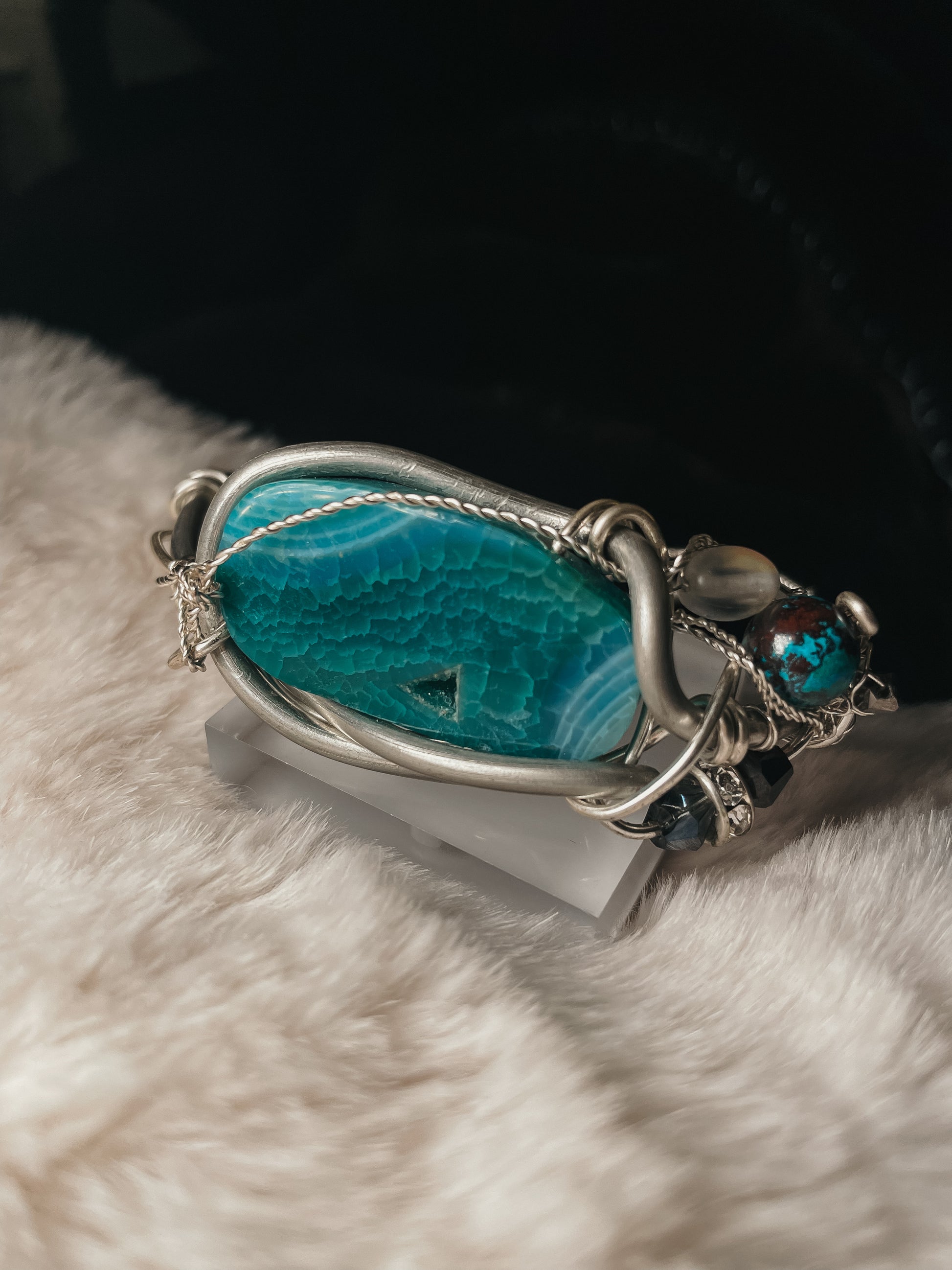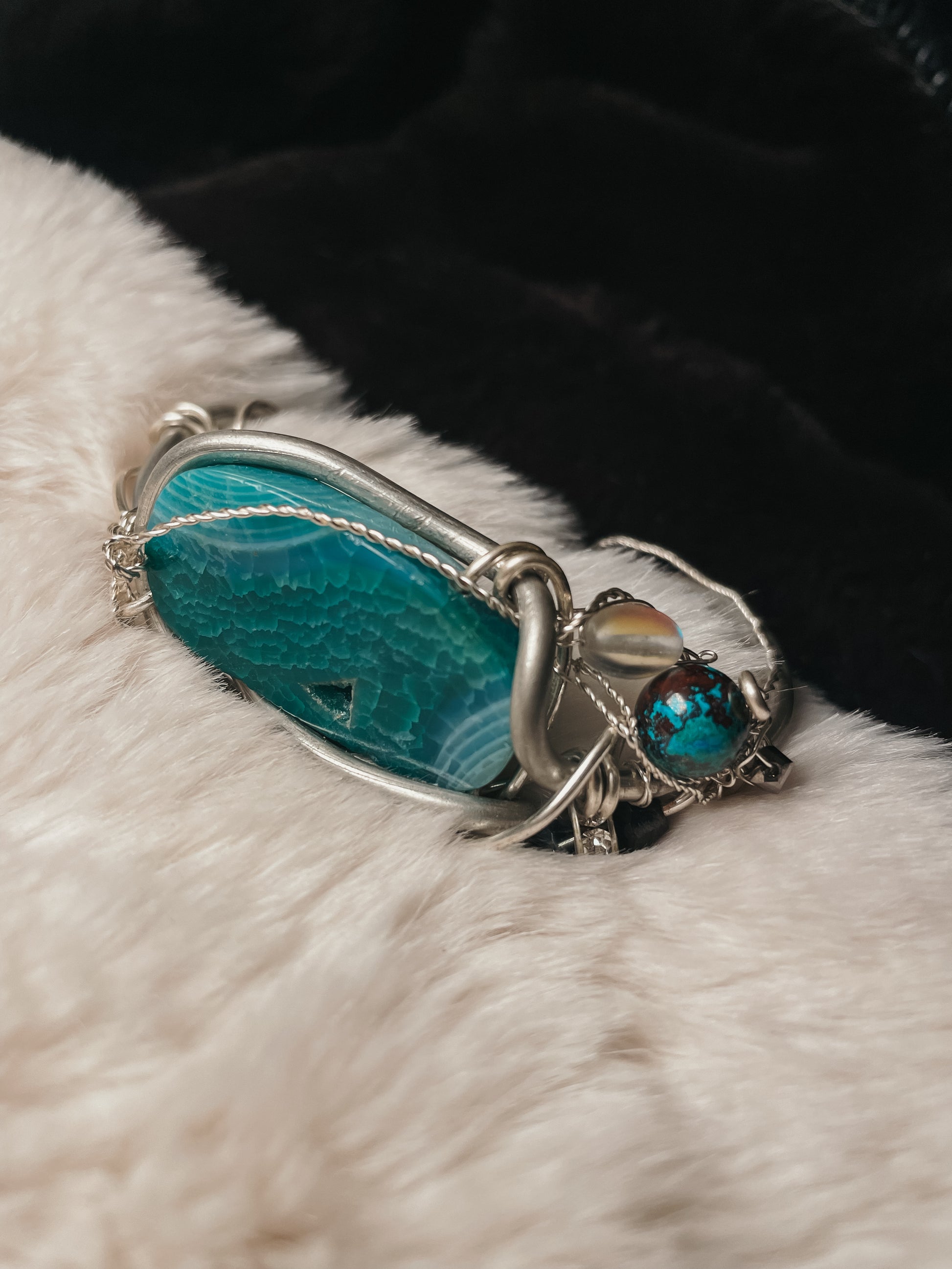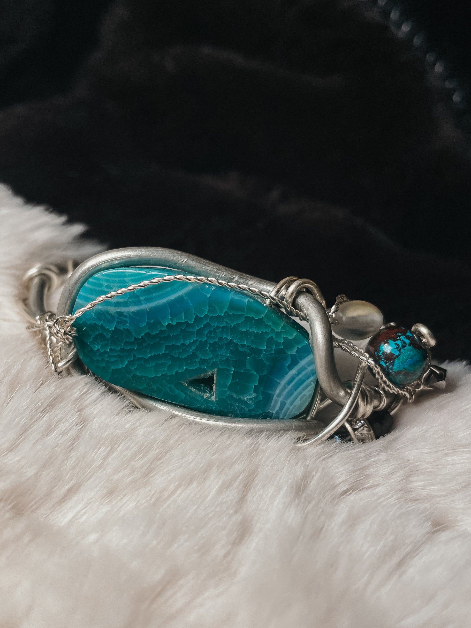 The Oracle of the Deep Bracelet is handcrafted in Argentinian silver and centered around a striking blue agate geode slice, revealing natural crystalline textures that echo ocean depth and ancient wisdom. The stone is framed in sculptural silver wire, creating a piece that feels both grounding and otherworldly.