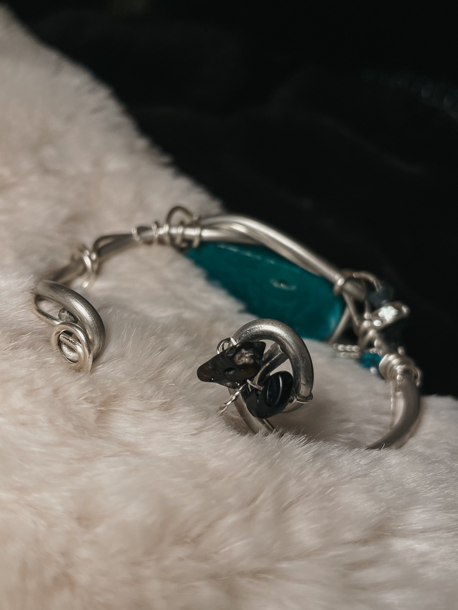 A small round bead of proven turquoise adds a vibrant accent of truth and protection, while black onyx set on the back of the bracelet offers a hidden layer of grounding and energetic shielding. This intentional placement makes the piece feel deeply personal — designed to protect from all sides.