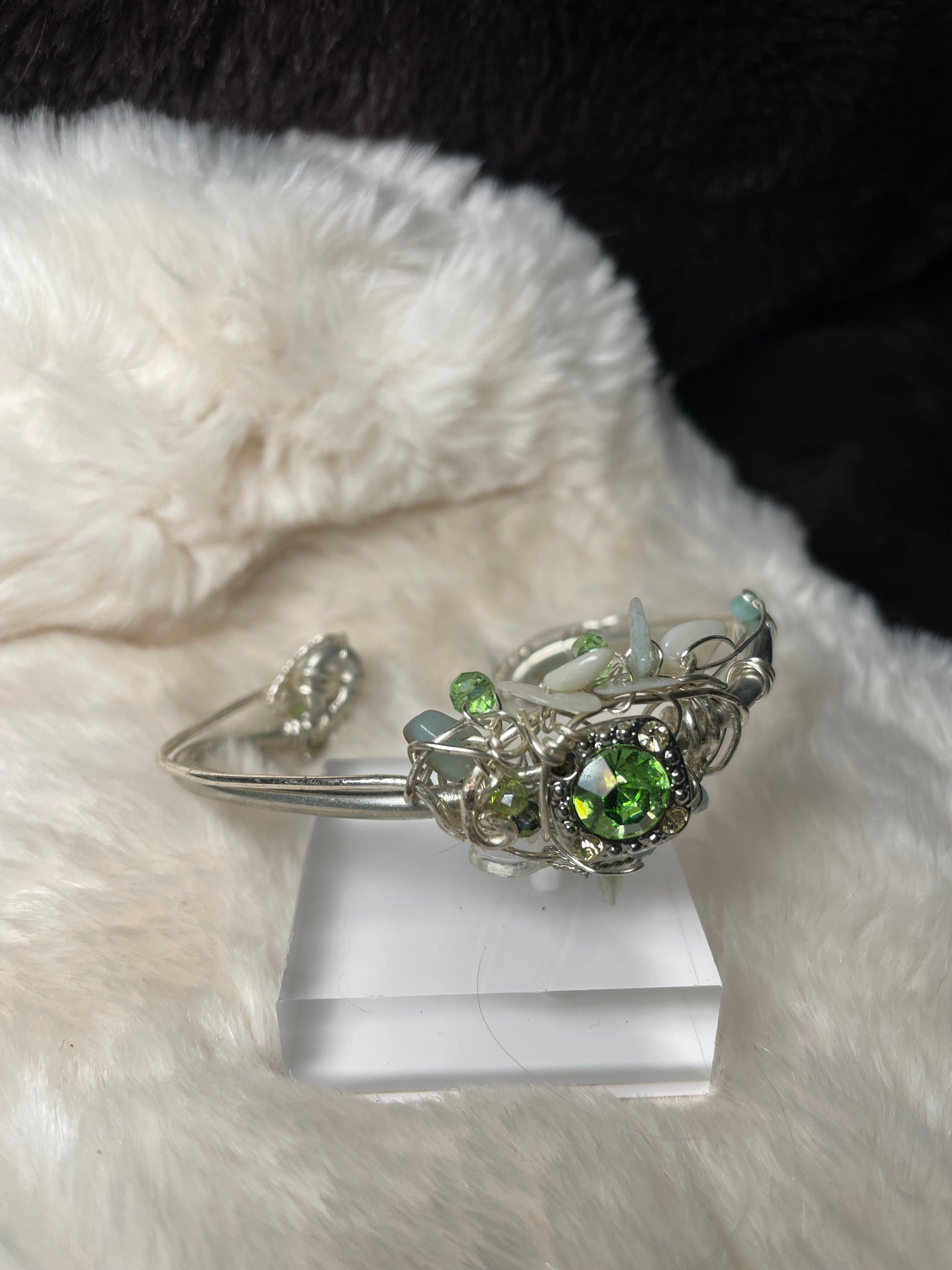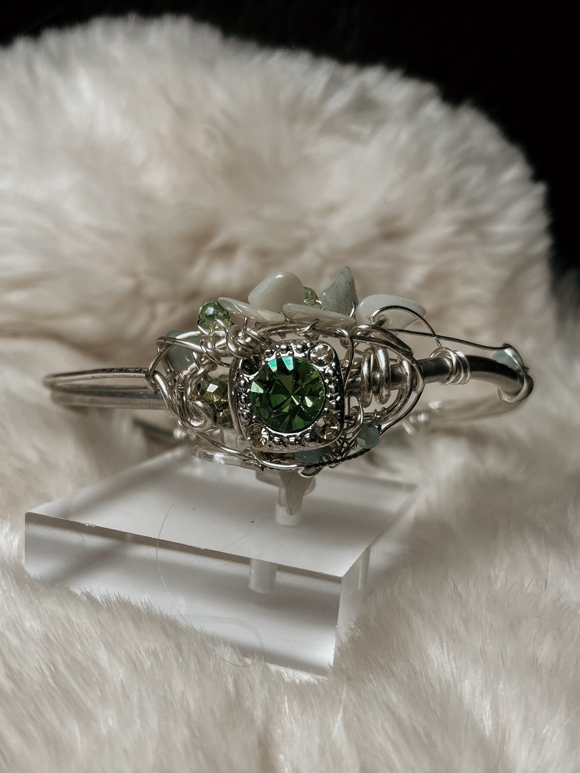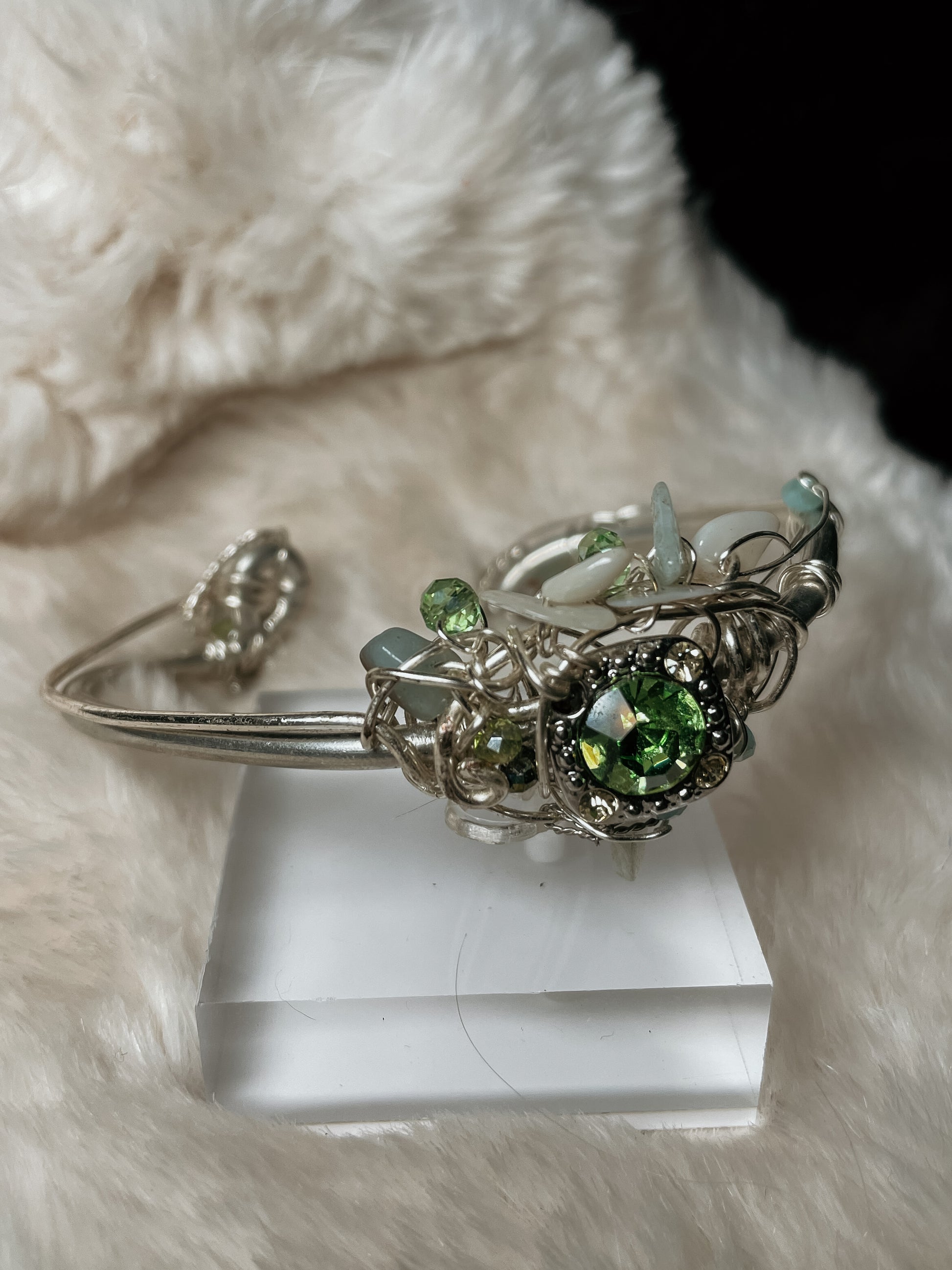 At its center glows a deep green faceted crystal, set in a sculptural halo of hand-formed Argentinian silver. The green core represents growth — not overnight transformation, but the slow, intentional becoming that comes from believing in yourself even before the world catches up.