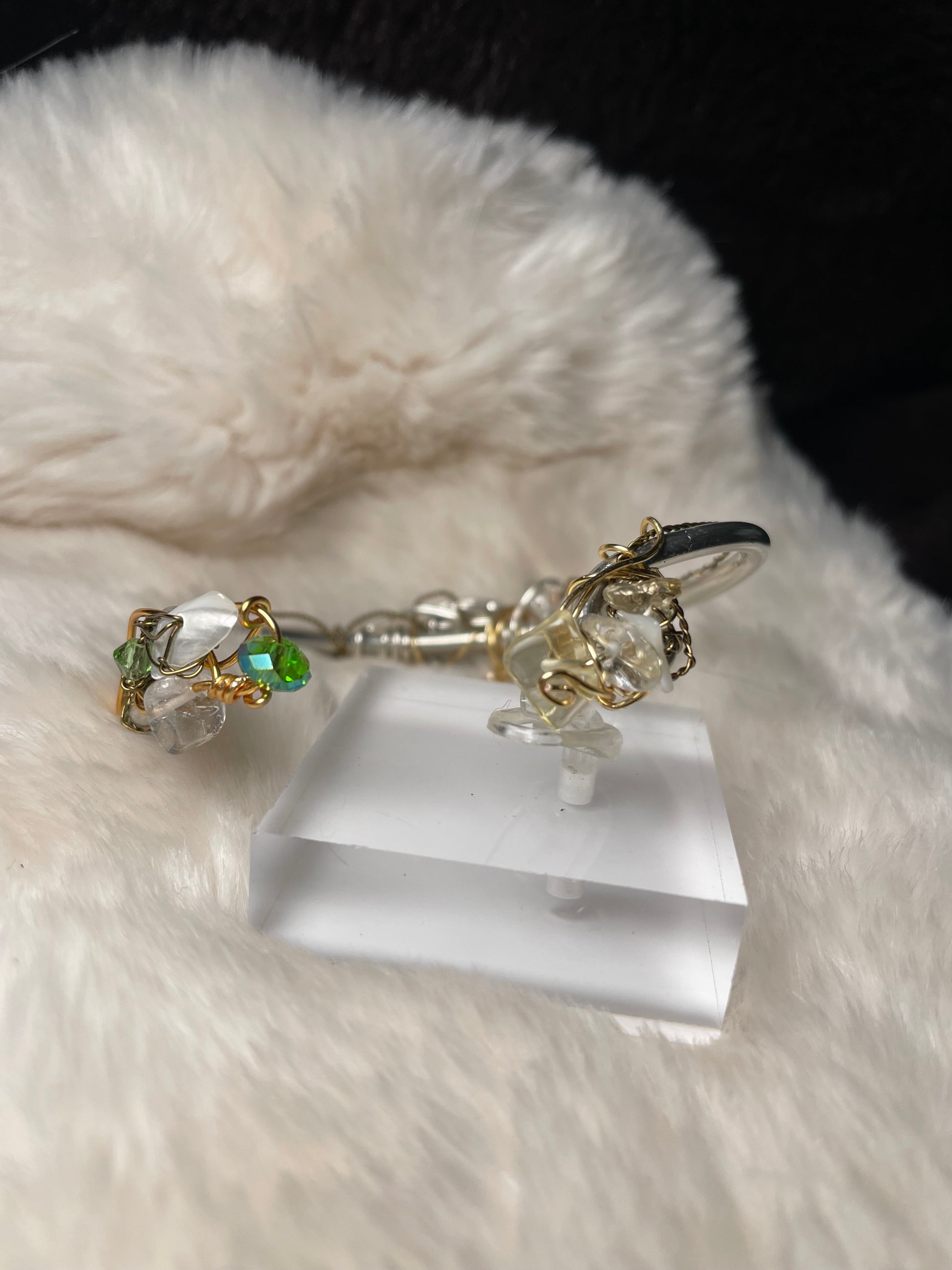 At its center shines a vibrant green crystal rhinestone, radiant and alive, capturing the essence of playful magic and fearless imagination. Wrapped in hand-sculpted Argentinian silver and accented with warm gold-toned wire, the design balances whimsy with strength.
