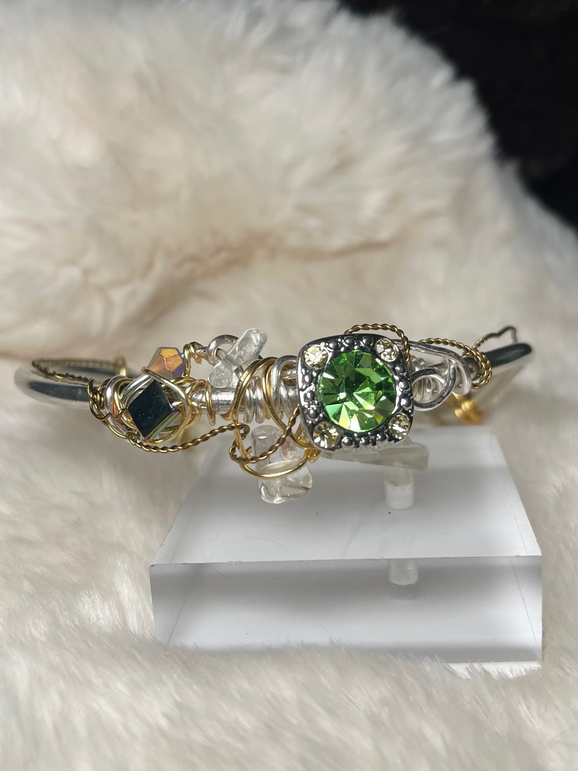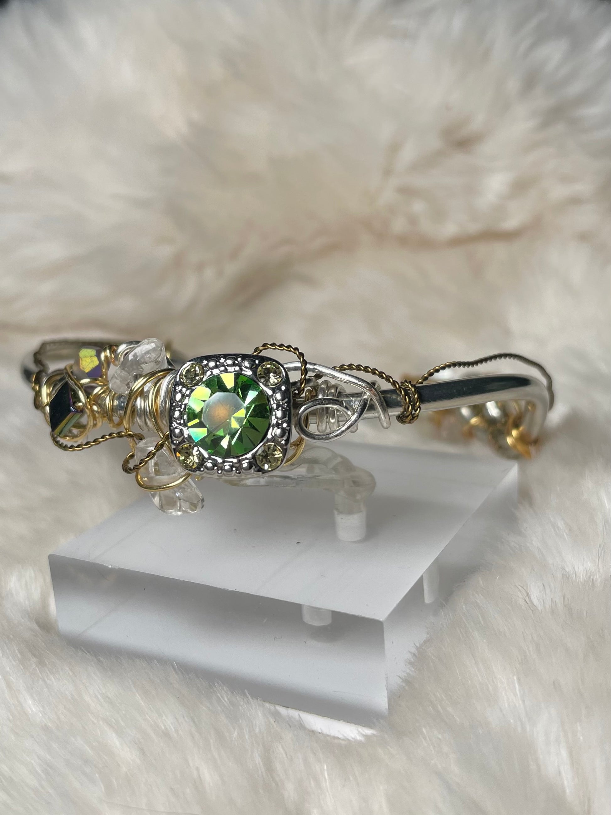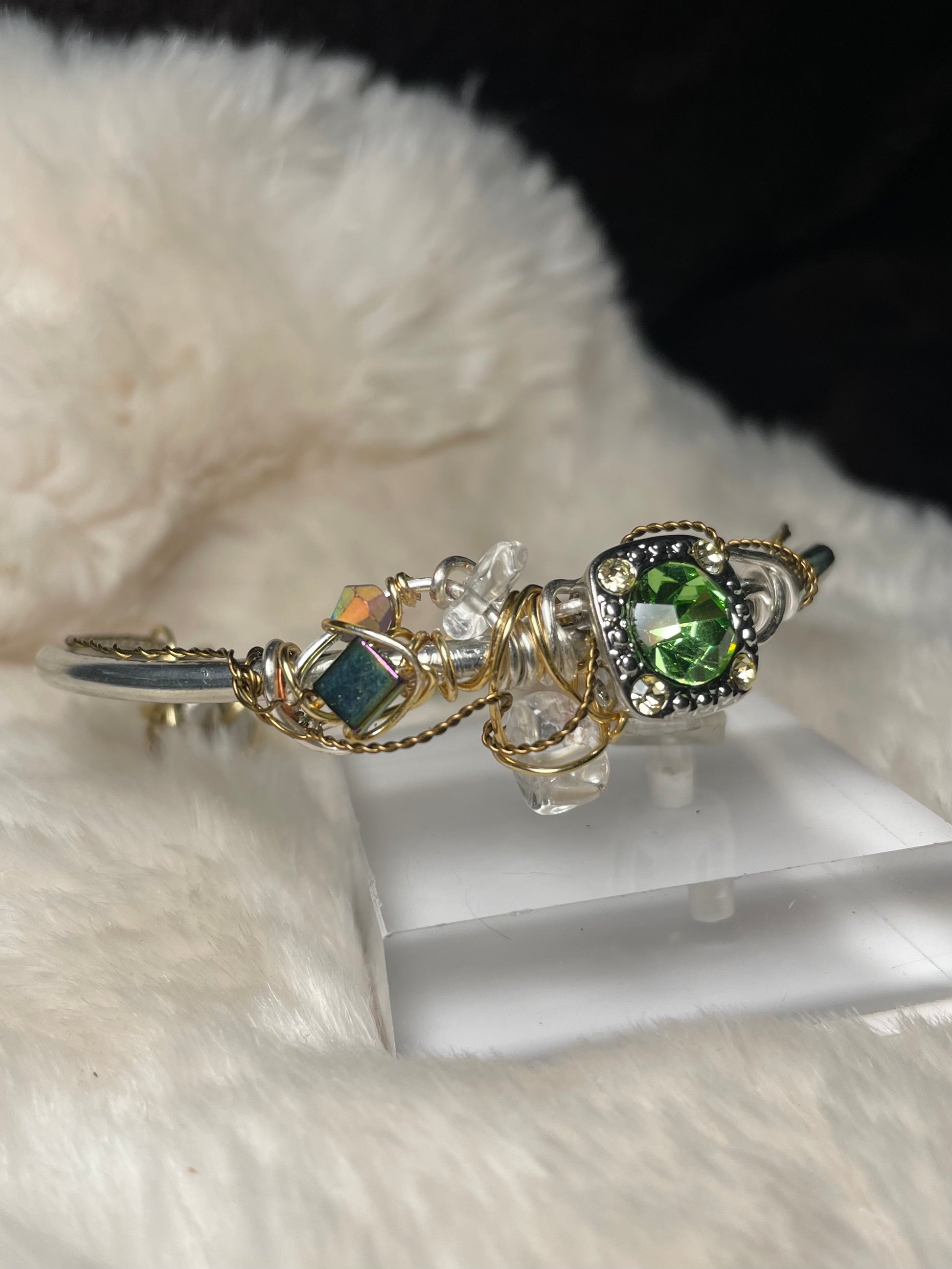 A brilliant, fairy-green rhinestone set in a square halo. It acts as the visual heart of the bracelet — vivid, playful, and full of light.