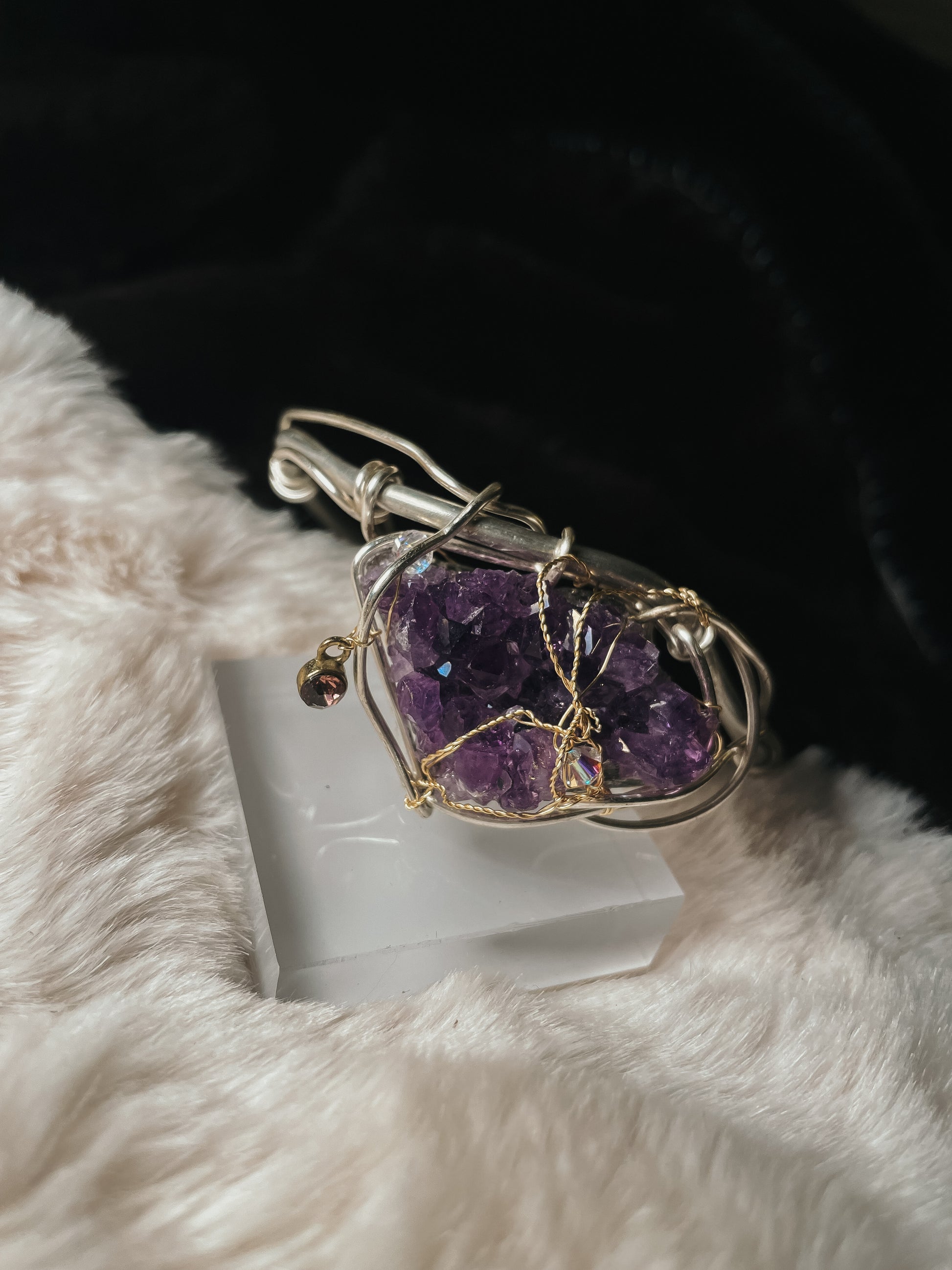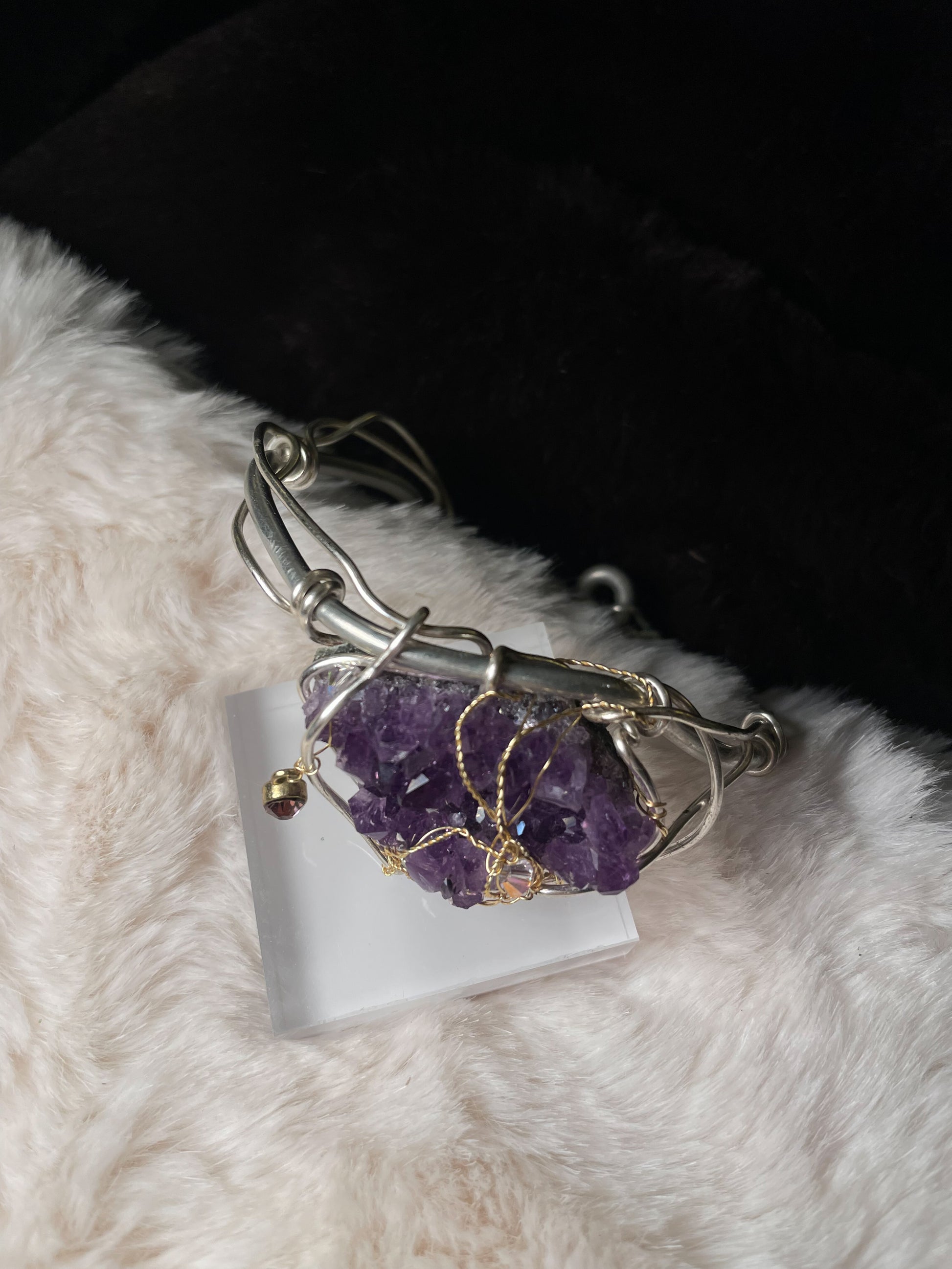 The Violet Ascension Bracelet is handcrafted in Argentinian silver and centered around a richly textured amethyst druzy cluster, prized for its deep violet hue and naturally radiant crystalline surface. The amethyst is cradled in sculptural silver wire, accented with delicate gold-toned wrapping that creates an elegant contrast and a sense of intentional flow.